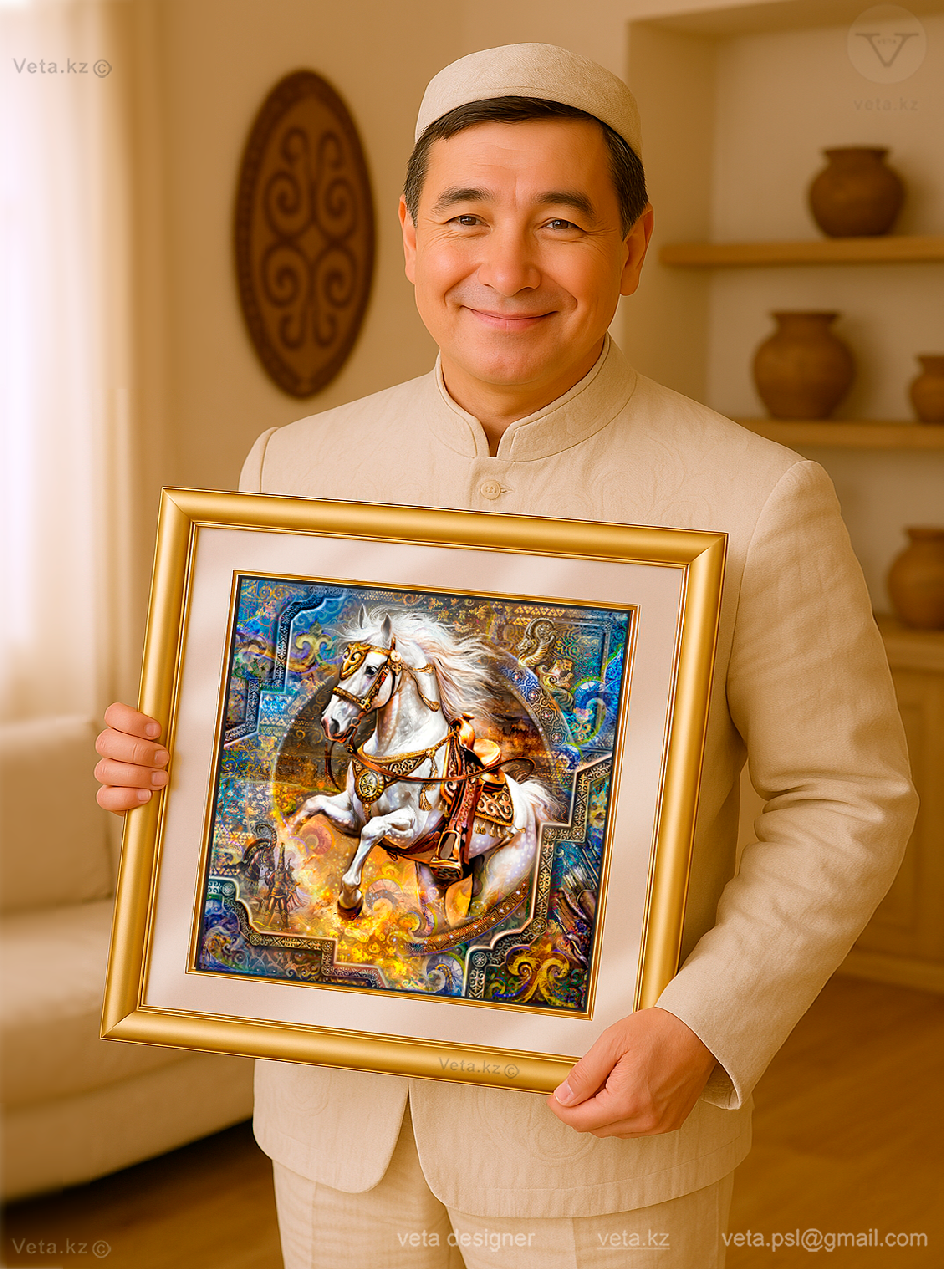 🔸 Величественный силуэт Тулпара, прорисованные доспехи и сбруя, золото и казахские узоры — всё это вплетено в богатую фактуру композиции, где каждый элемент говорит о мужестве, доблести и историческом наследии Великой Степи.