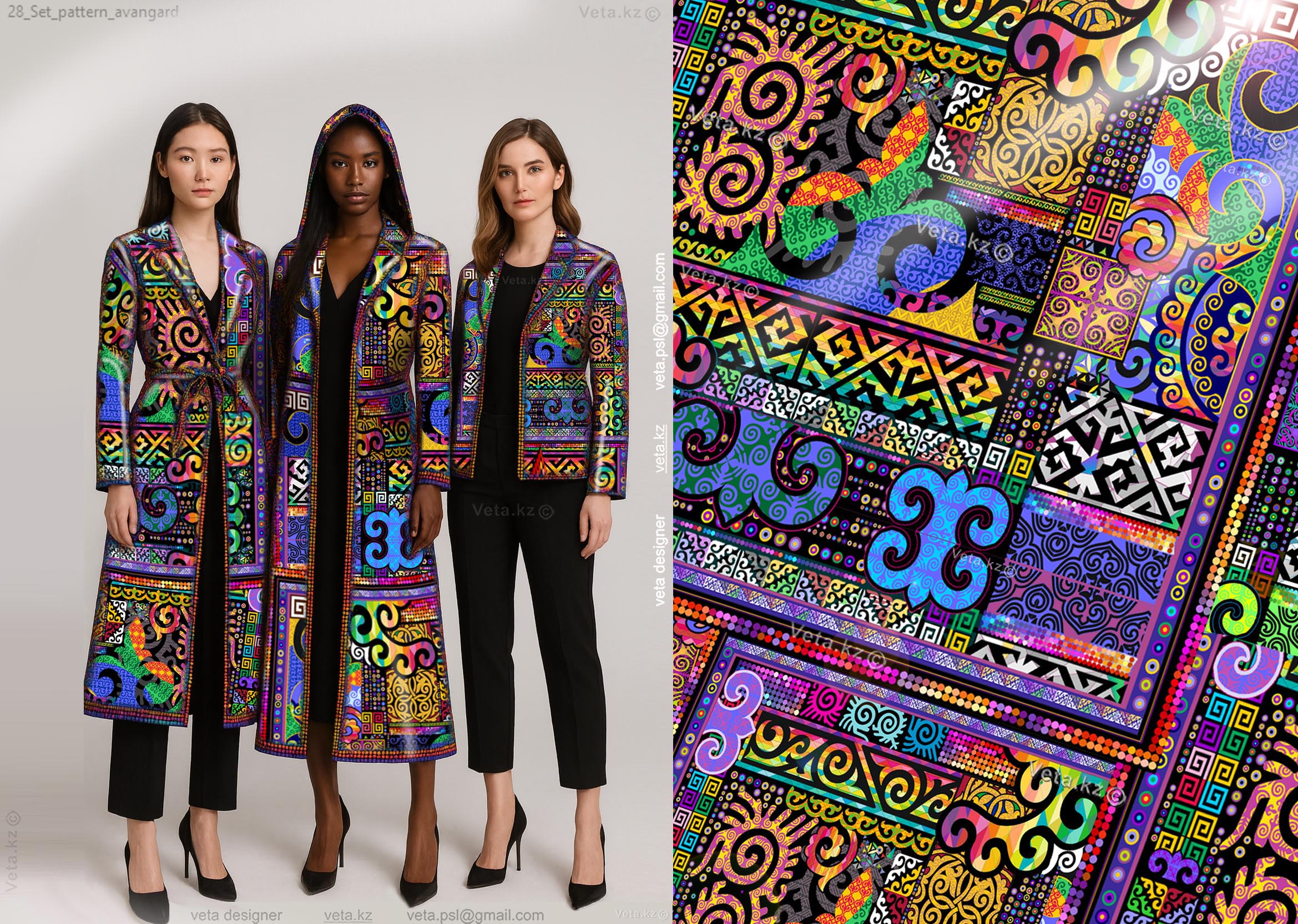 Этот дизайн — уникальное авторское произведение Веты, соединяющее в себе богатство орнамента и смелость авангардной эстетики. Композиция построена на синтезе казахских и центральноазиатских орнаментов, каждый элемент которых несёт глубокий символический и декоративный смысл.